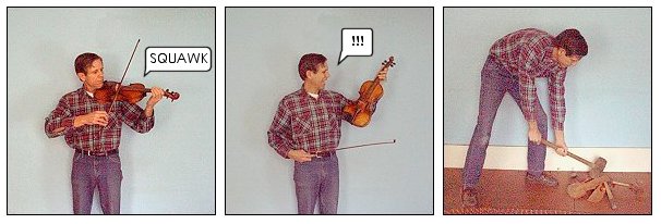 There is no common English equivalent for this proverb, but it has a special meaning for ME! I have always been pretty much of a "Jack of all trades", but, especially nowadays, I find that there are some things I just CANNOT do! This proverb is SO fitting to me because I also know how to play the fiddle; or should I say, I know how DIFFICULT it is to get MUSIC to come out of the "#%@*$#!" thing! "Skrzypce", the Polish word for "violin", is a plural noun derived from the word "skrzyp" which literally means a "creak" or a "groan"! What an APT description of the "instrument of torture" that it can be, in the WRONG hands!! | |